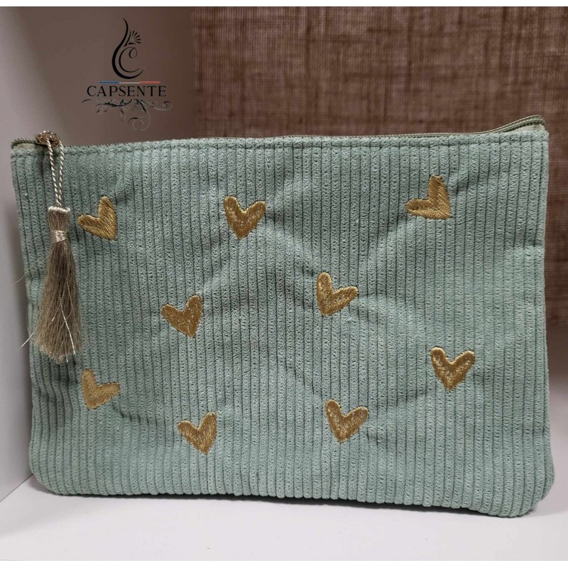Pochette petits cœurs velours vert d'eau ou blush