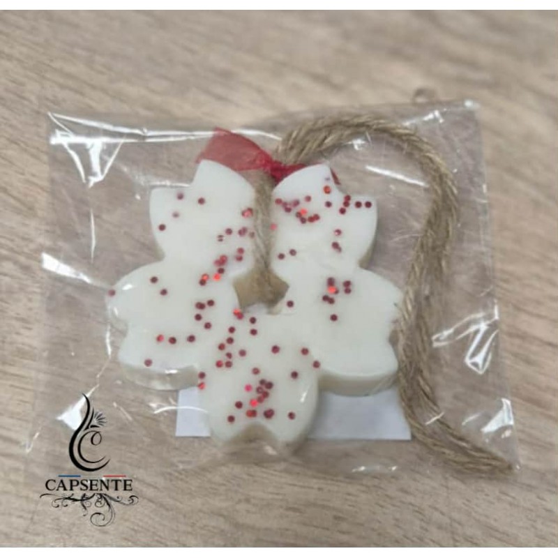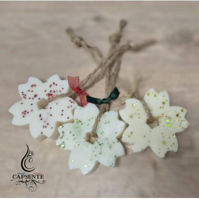 Cire 100% Végétale : Respectueuse de l'environnement et de votre intérieur. Parfum Envoûtant : Senteur unique et réconfortante "Marché de Noël". Design Élégant : Forme de fleur double décorée de paillettes délicates pour une touche festive. Facile à Suspendre : Munie d'une cordelette en jute naturelle et d'un petit ruban décoratif.